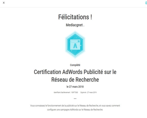Je viens d’obtenir La Certification Google AdWords. (Il n’y en pas pas beaucoup dans le Cantal, perso je n’en connais pas..)